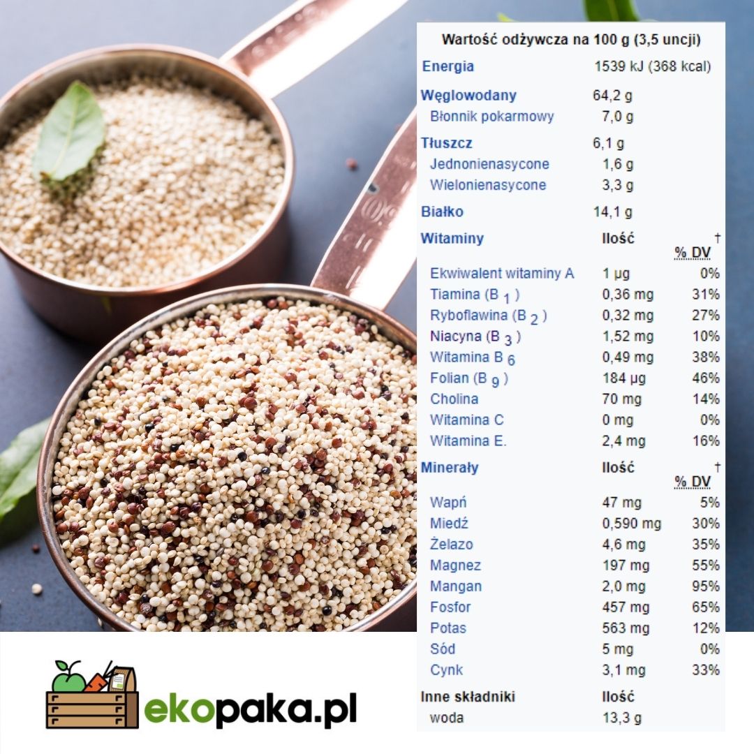 Quinoa komosa ryżowa biała wartość odżywcza w 100 g Wartość energetyczna - 1540 kJ / 368 kcal.